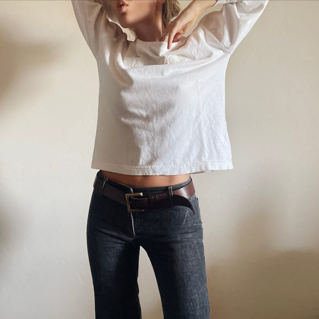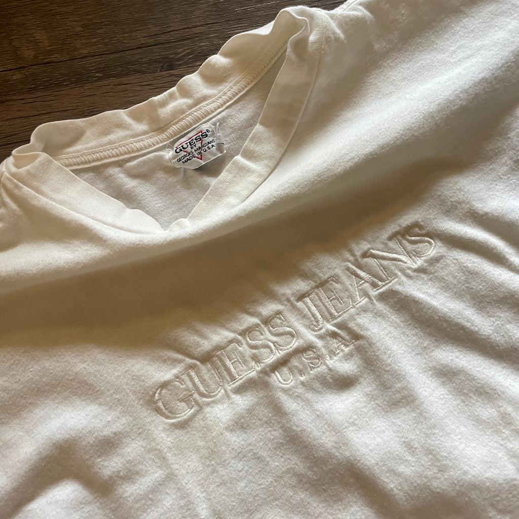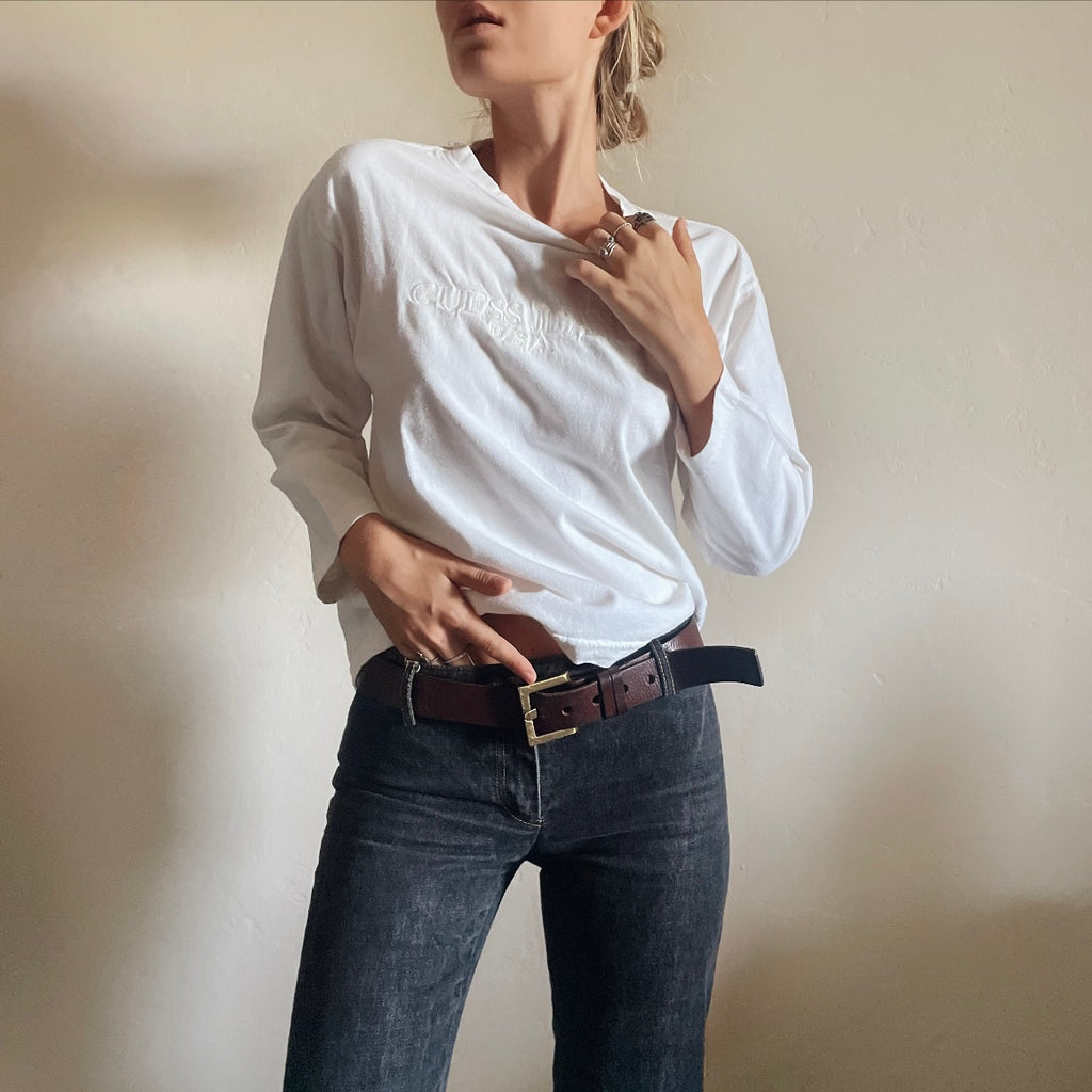 The dream 90’s tee. Very tempted to add this to my personal archive. Perfectly tailored, and lose fitted at the same time. Absolutely perfect with your favorite vintage denim (preferably guess). A few marks and discolor line shown to the white, in overall great vintage condition. 100% cotton. Tagged a size Small…all measurements below to ensure desired fit.