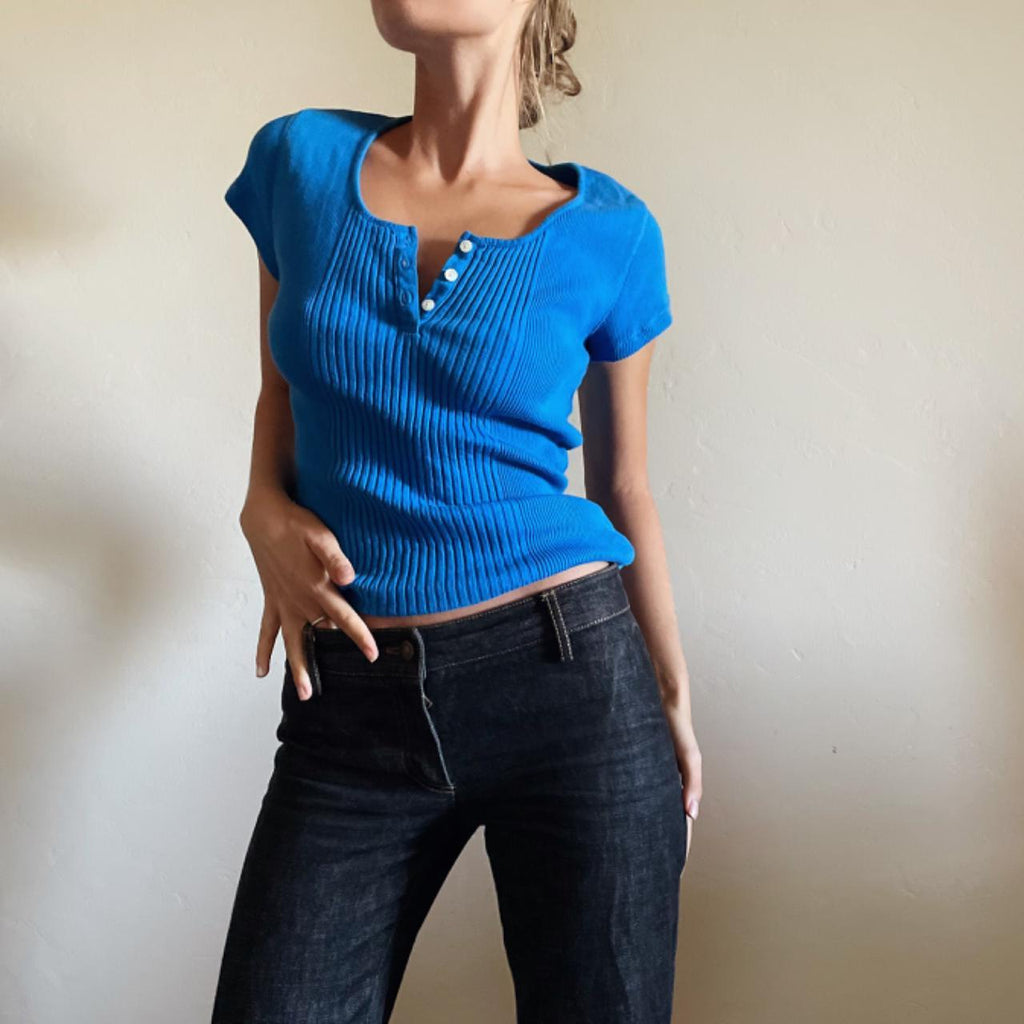 A classic blue, with a ribbed texture, and flattering design. Perfectly pairs with your favorite vintage denim. Casual wear from time, in awesome vintage condition. Might be best for a S/M, but please see all measurements below.