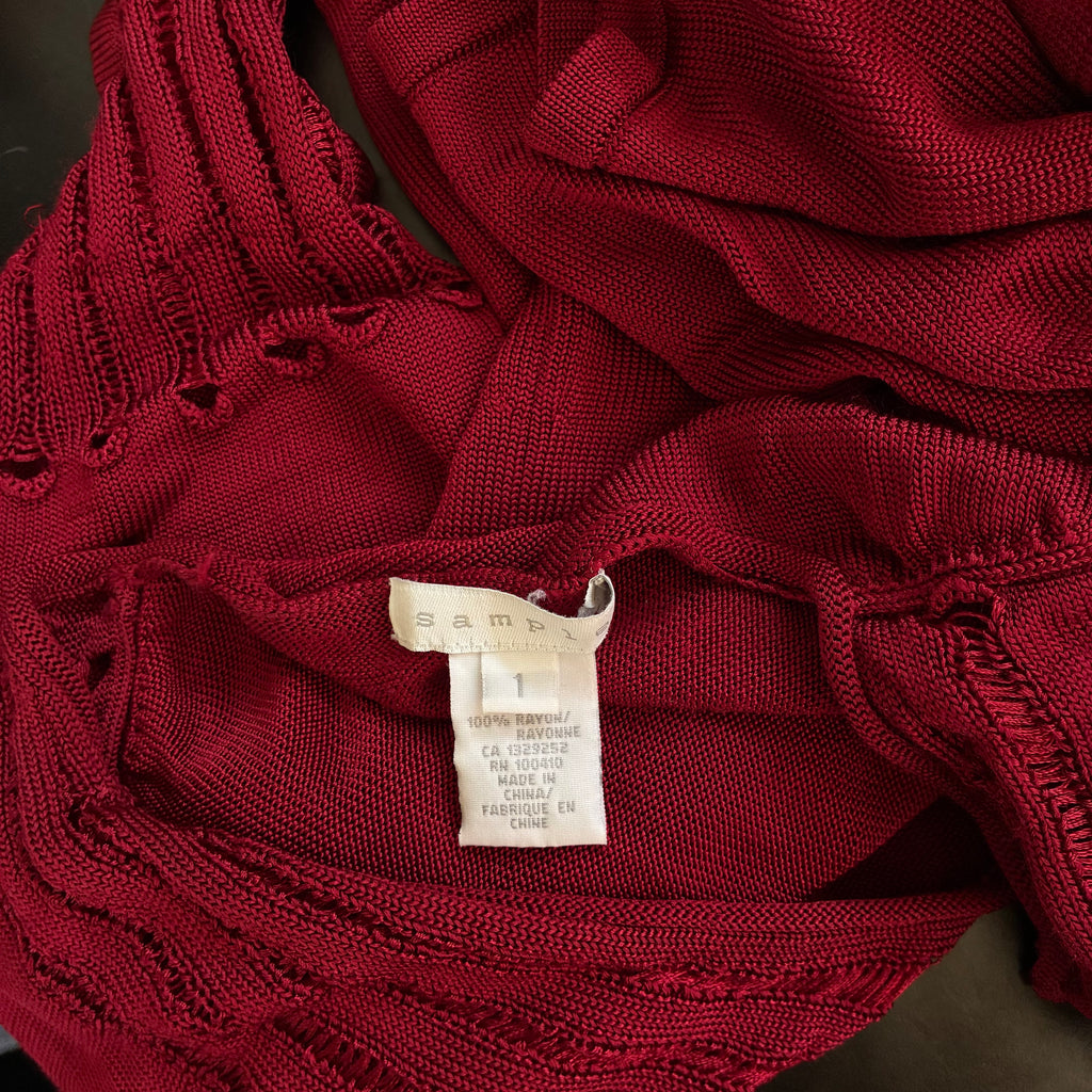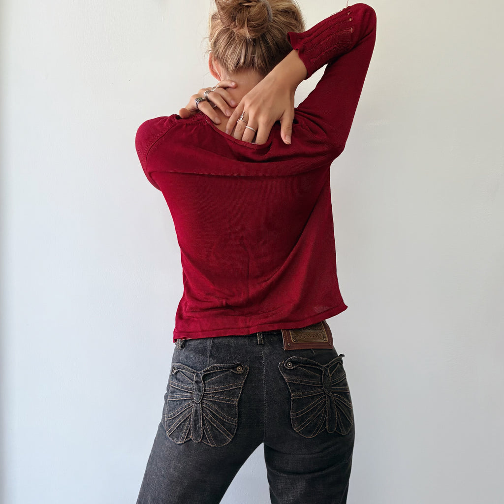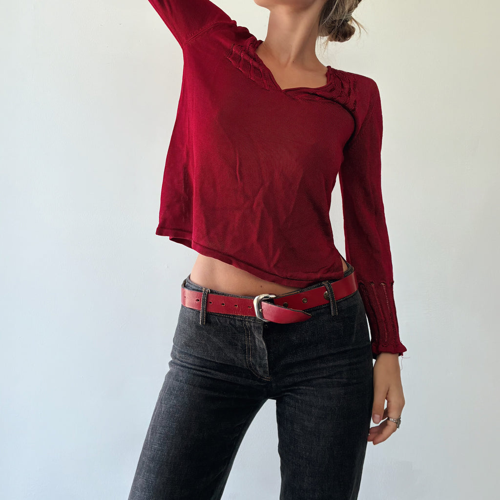 Gorgeous top. Beautiful deep wine rouge red, with a beautiful design and fit to the body. There is some pulling to the thread, but overall great condition ready to be styled and dressed. Tagged a size 1, best fits Xs. Measurements below to ensure desired fit.