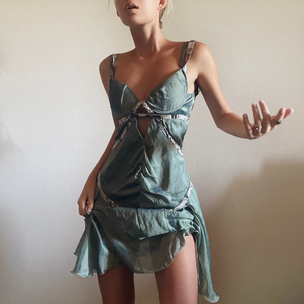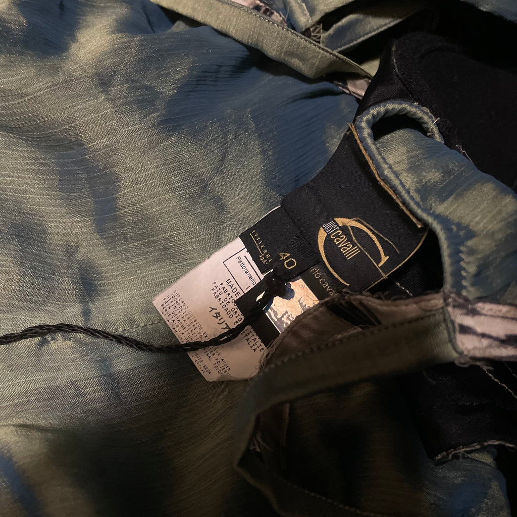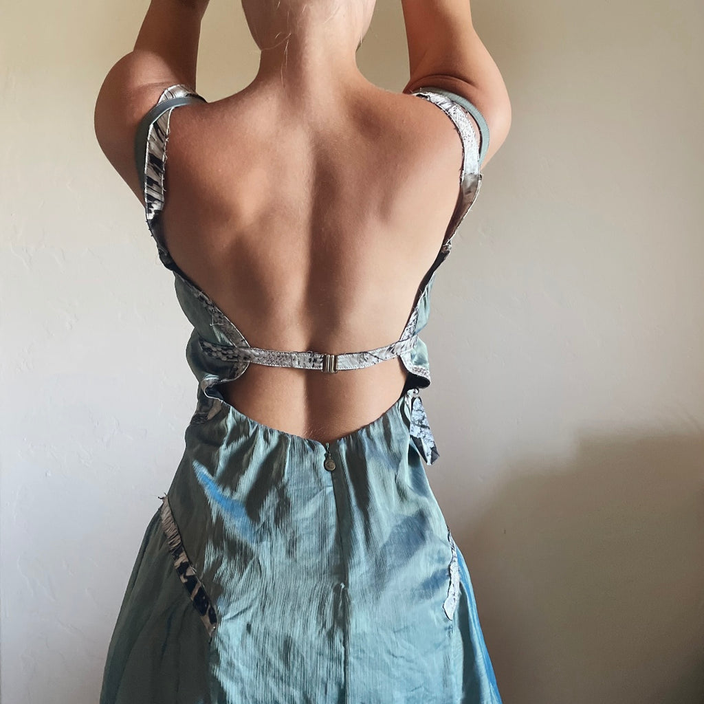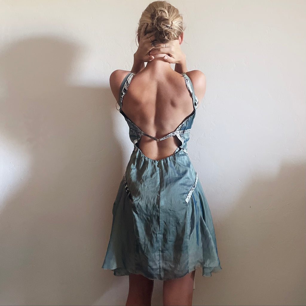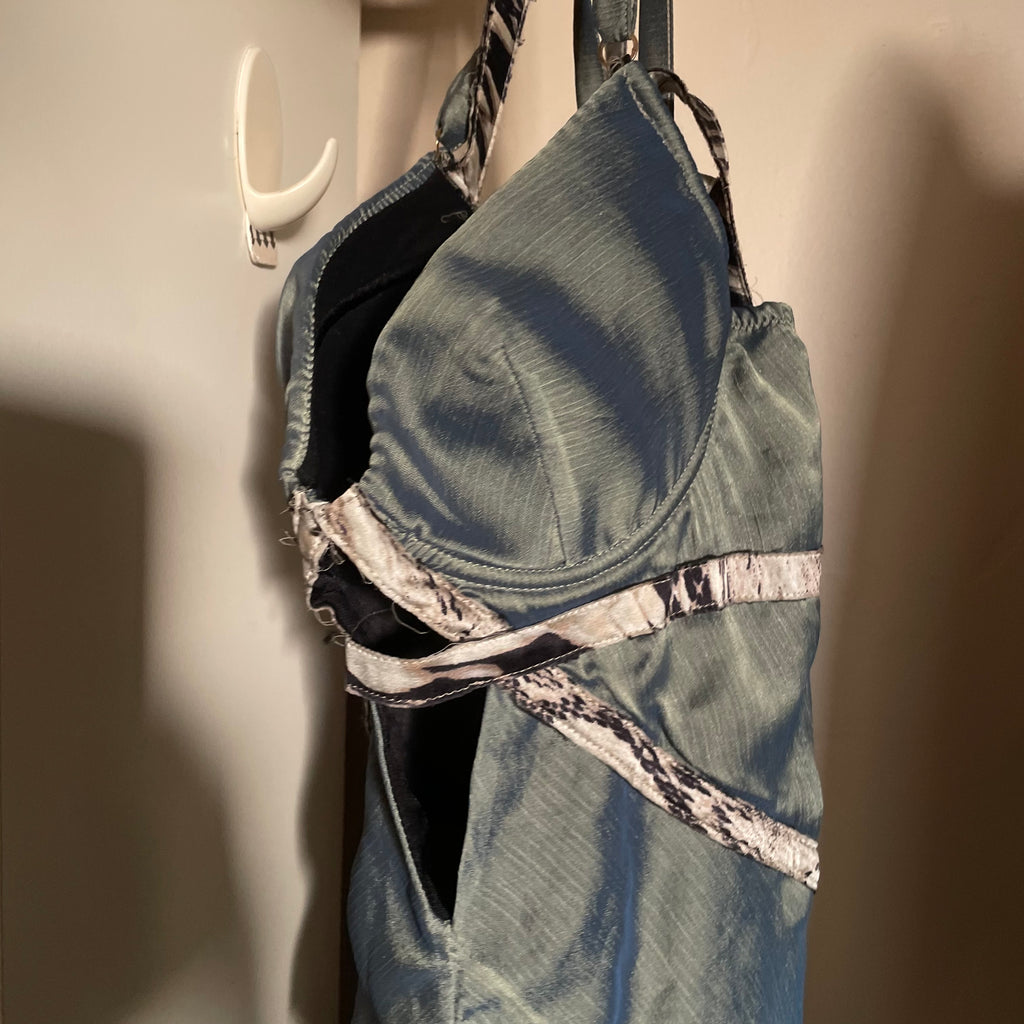 Absolutely STUNNING Roberto Cavalli dress. The dream fairy/pirates of the Caribbean dress. Such beautiful detailing to this dress. An incredible reflective teal sheen, with straps to be worn on/off the shoulder. Feathering to the lining that adds to its look, in overall beautiful vintage condition. Tagged a size 40, might be best for a bustier Xs. Please check all measurements below to ensure desired fit.