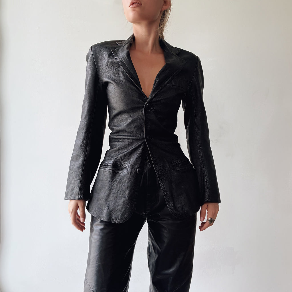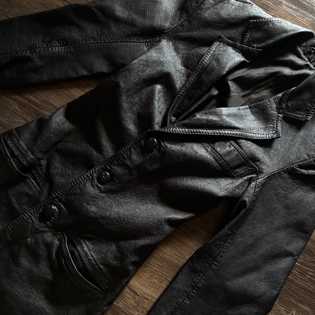Matrixed, sleek, molded, flattering. This jacket is incredible. Very rarely does a leather jacket mold to your body this well. A beautiful thick leather, 3 button structure. Has been sent to a leather cleaner, still has its tag. Causal wear from age, in great vintage condition. Best fits Xxs, all measurements below to ensure desired fit.🐈⬛
