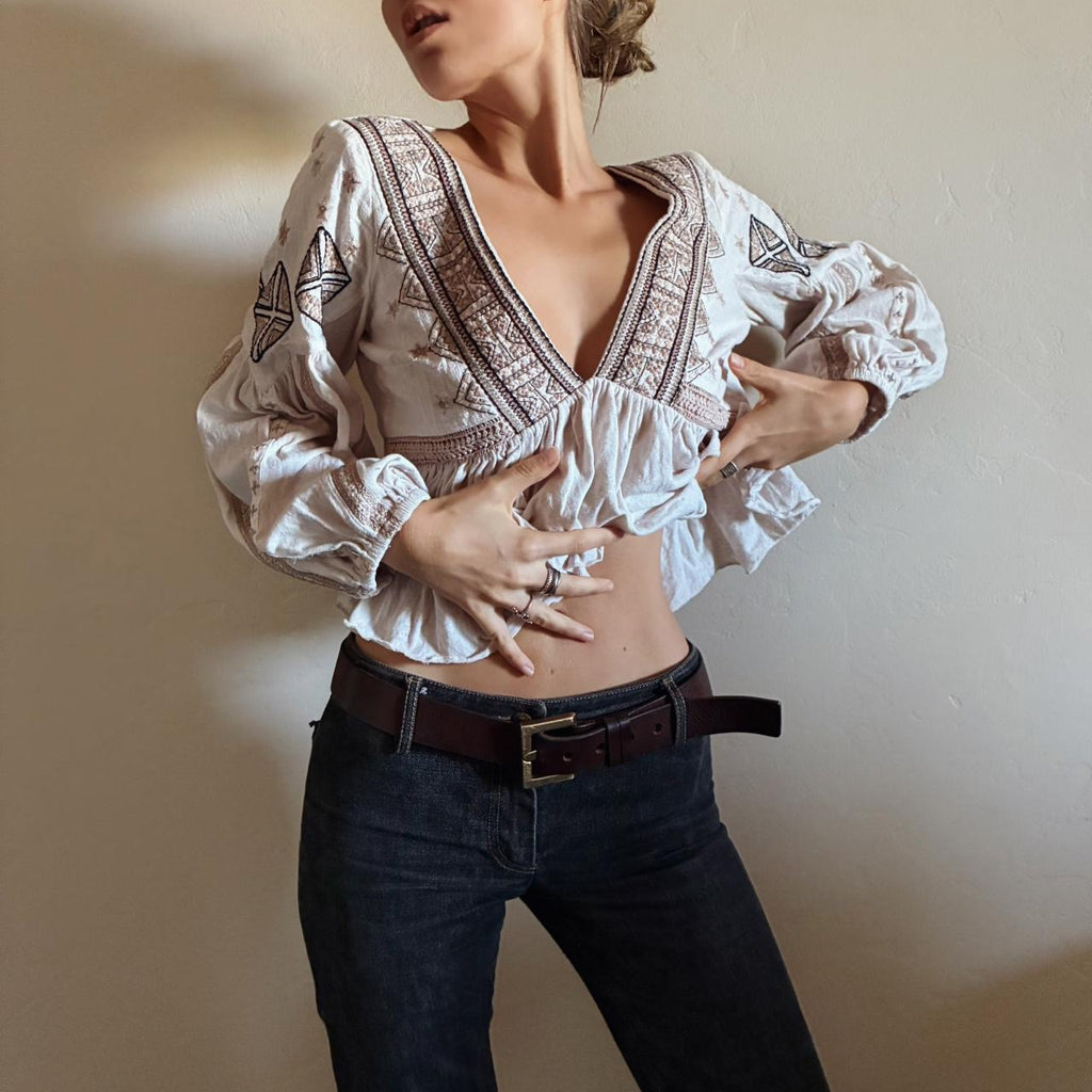 Absolutely gorgeous top! Great to pair with your favorite vintage denim/trousers/skirt. A flattering fit and length. Causal wear from time, overall great condition. No inner tags except part of one shown…best for an Xs imo. All measurements below to ensure desired fit.🤍