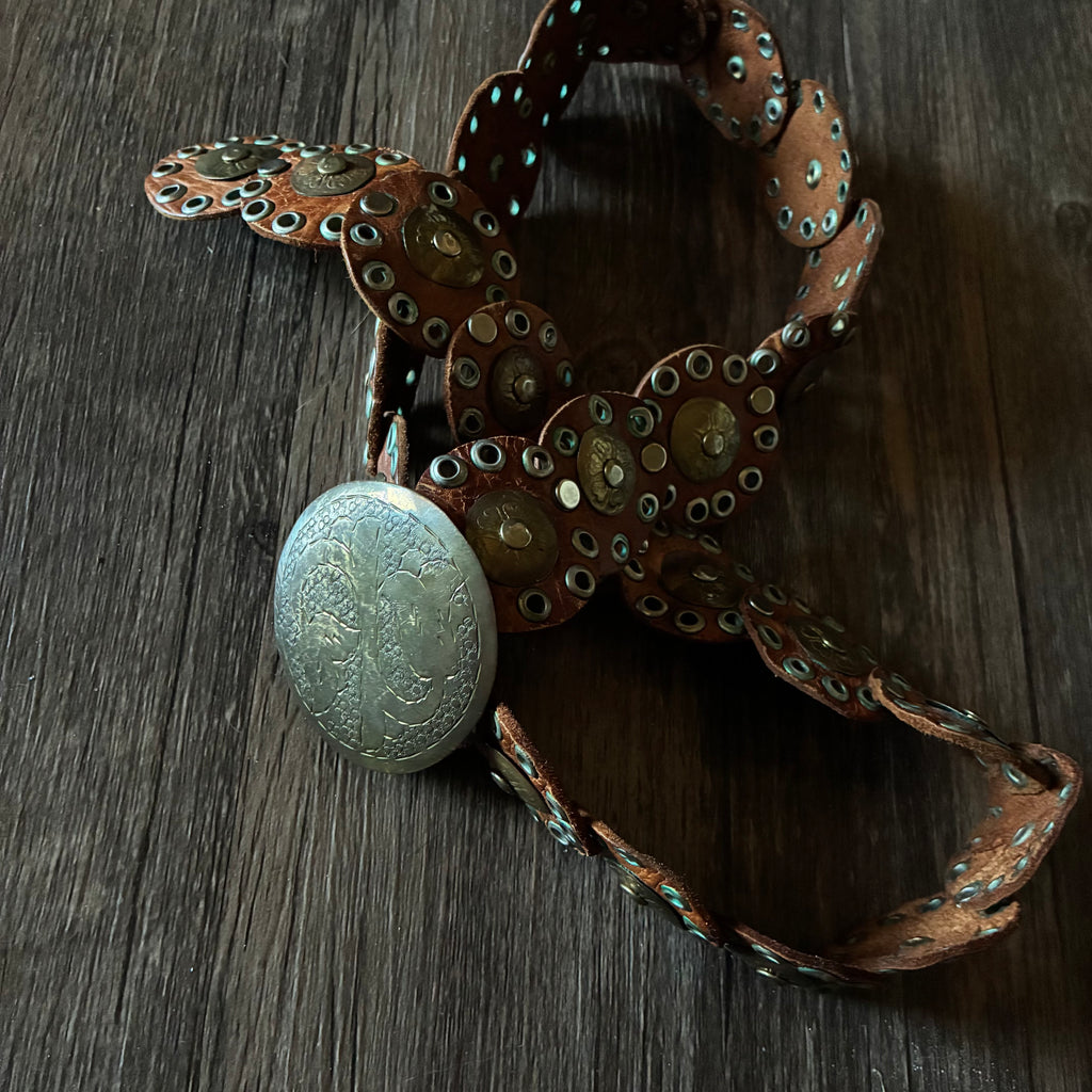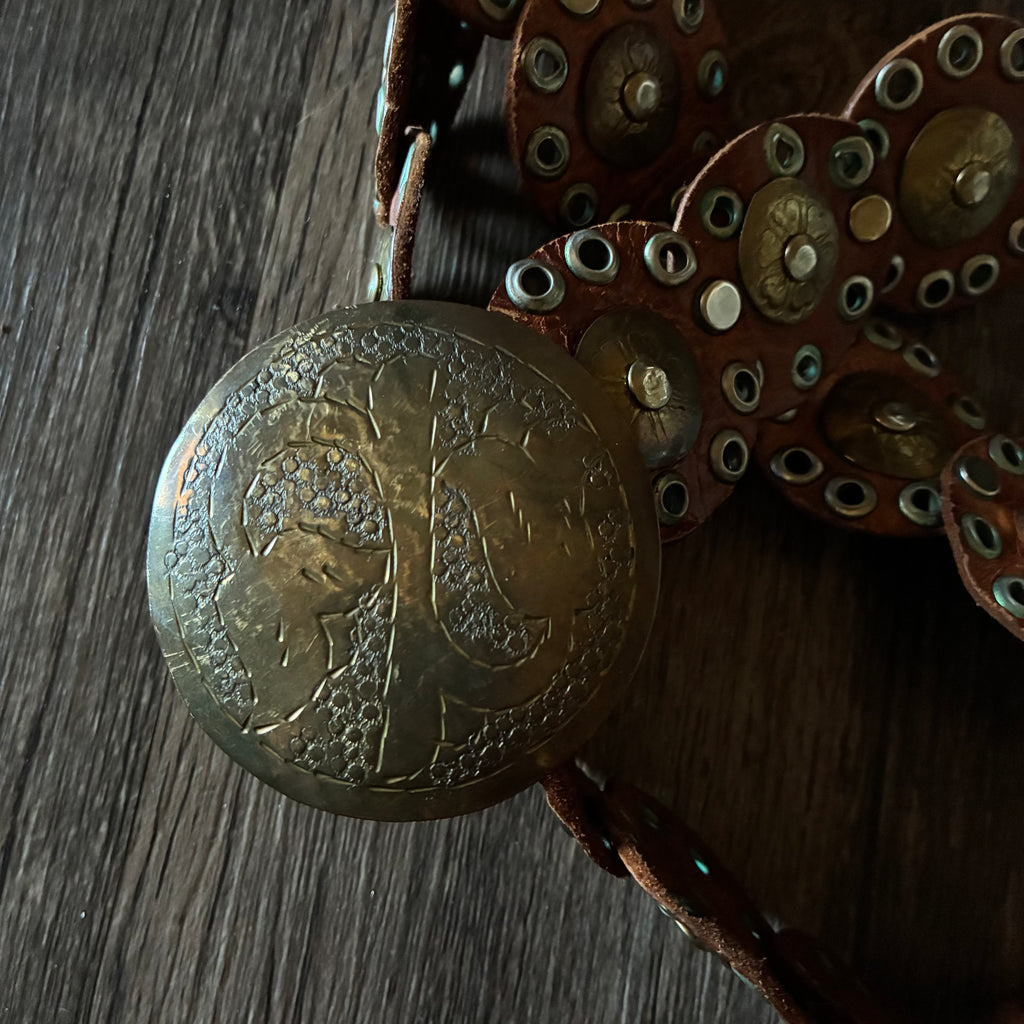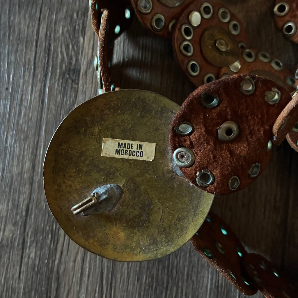 Absolutely stunning vintage belt handmade in Morocco, brass detailing, thin leather with an adjustable structure. This belt is incredible. So beautiful and the perfect piece to style. Adjustable, so can be worn by multiple sizes, and in numerous ways. Measurements below to ensure fit.